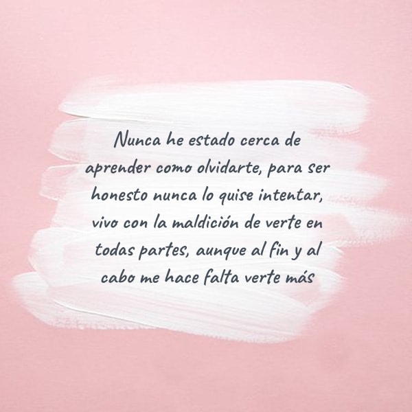 Nunca he estado cerca de aprender como olvidarte, para ser honesto nunca lo quise intentar, vivo con la maldición de verte en todas partes, aunque al fin y al cabo me hace falta verte más